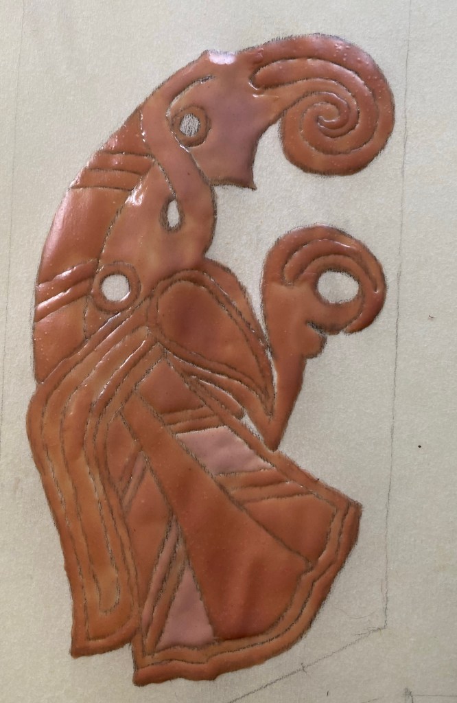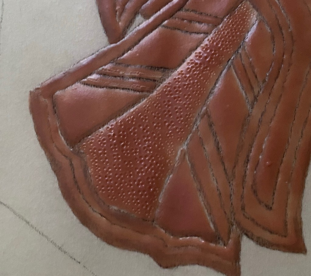 The design layoutFreshly laid gessoImpressionsI drew in outlines on pergamenata, then used raised gesso to create each bird, imprinting the patterns on the solidifying gesso. (Hindsight: should have done those a bit sooner than I did…the gesso was quite firm!)Getting a photo of the gold leaf sparkling was a bit hard. The sword contained the transliteration of the award in runes to present the award and the hilt of the sword became his (future) heraldry.