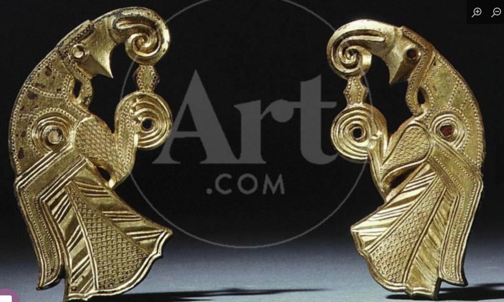 I have seen variations on these Viking birds for a while as reproduction pieces, jewelry, etc. These pieces are pulled from harness mounts recovered in a find from Gotland in Sweden and dated to about 600 n. Chr. They are now on exhibit in the Statens Historiska Museum in Stockholm, Sweden.) centered around a broad sword.