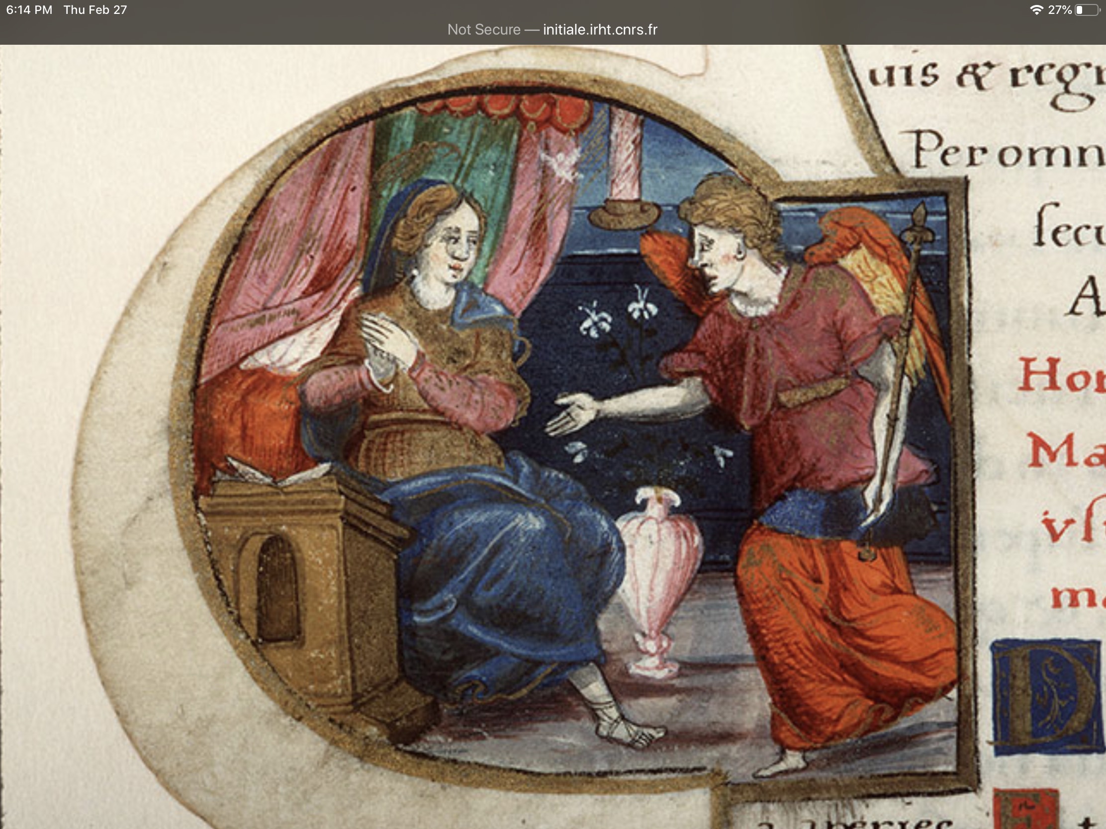 Size view.Showcasing her initials in 3 different gold “strengths” as a monogram.The exemplar’s page of influence.Progression of the piece.My first “people”. Me offering my Laurel a Pearl, irises as our shared fleur de Lys influence and on her under gown, more raised gold fleurs. While I see so much I would do differently now, working in miniature was very new and faces were intimidating.The exemplar’s page where Mary receives her news…