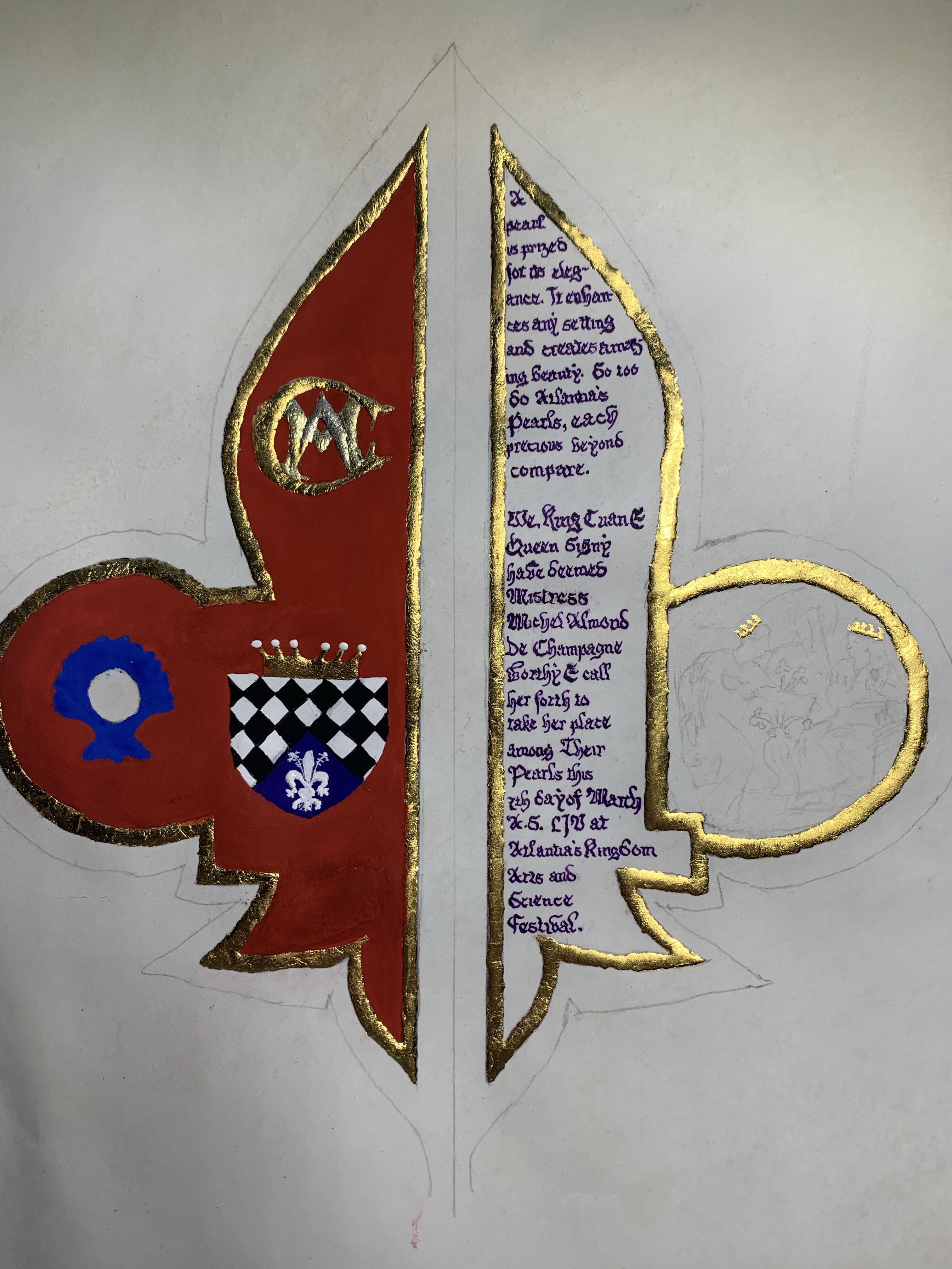 First and foremost, it is for my Laurel, Goodwife Michel Almond de Champagne. It is a turnabout that is rare for while she is a Laurel in A&S, she did not receive it in Atlantia. She has a similar award from the East, but she had done so much for Atlantia that all within our Pearls agreed this was due her.