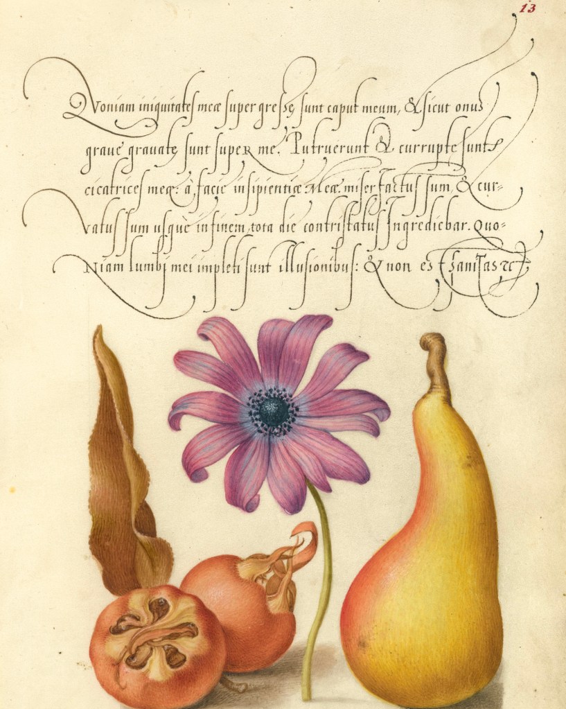 I chose this page because of its beautiful hand by George Bocskay, the Secretary to the Holy Roman Emperor, Ferdinand I. These hands were written between 1561 and 1562. (The illumination is by Joris Hoefnagel, about 30 years later.