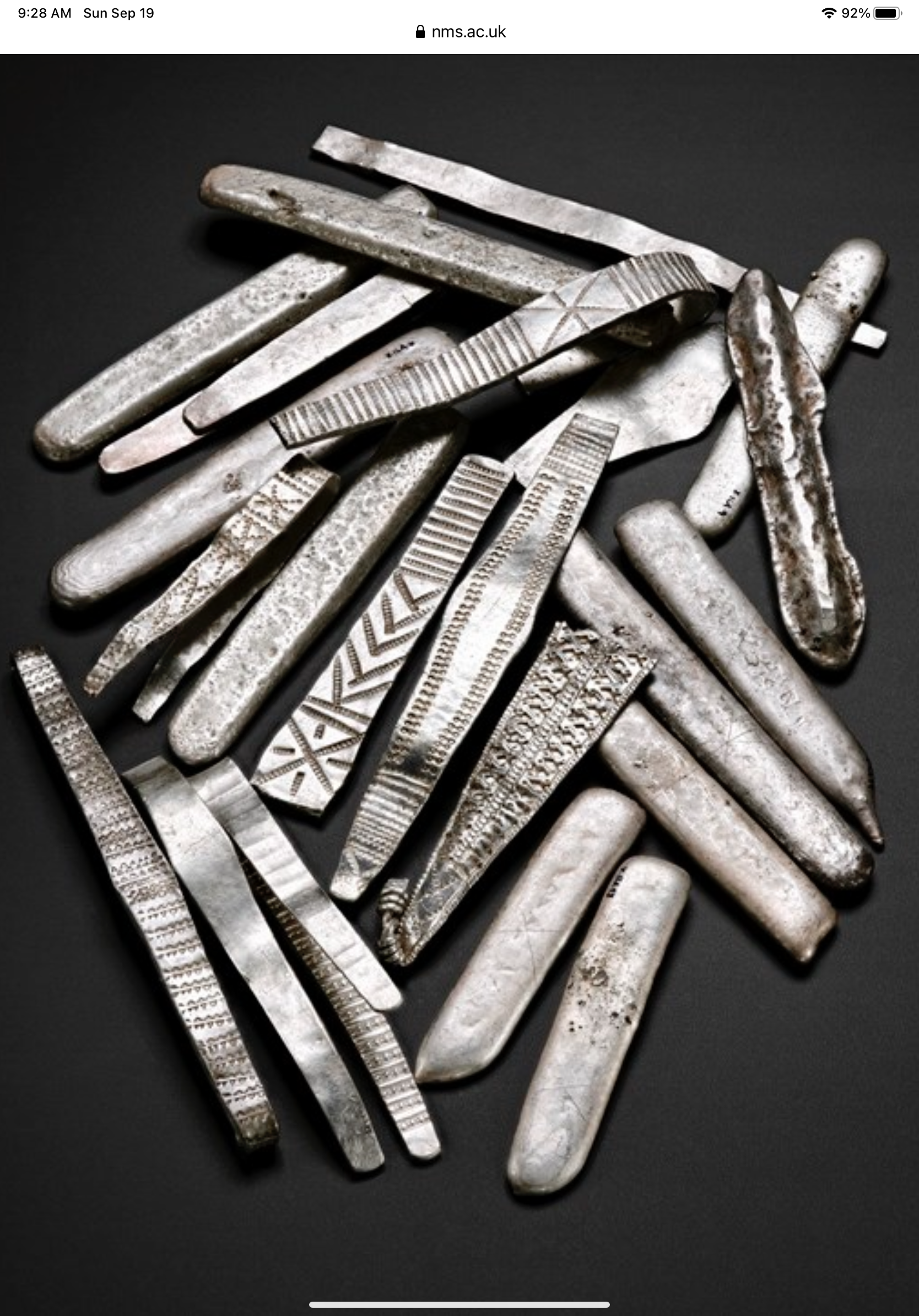 Next was the imagery of the scroll. I love “hoard finds”. Thinking of searching a farmer’s field or bog and being rewarded by hundreds-years-old treasure is amazing to me. I am fascinated by a more recent one called the Galloway Hoard, discovered in 2014. Not only does it have Viking era beads, bands and jewelry, but it has gold-flecked balls of dirt (thought to be collected from holy pilgrimage sites) as well as jewelry and a container thought to date possibly 200 years BEFORE the Viking items from Central Asia (noted as Zoroastrianism and Sasanian imperial iconography on the vessel). Its treasures wrapped in wool textiles from between 680 and 780 AD amazingly preserved. Such a unique and diverse find of beautiful things…perfect for this man.