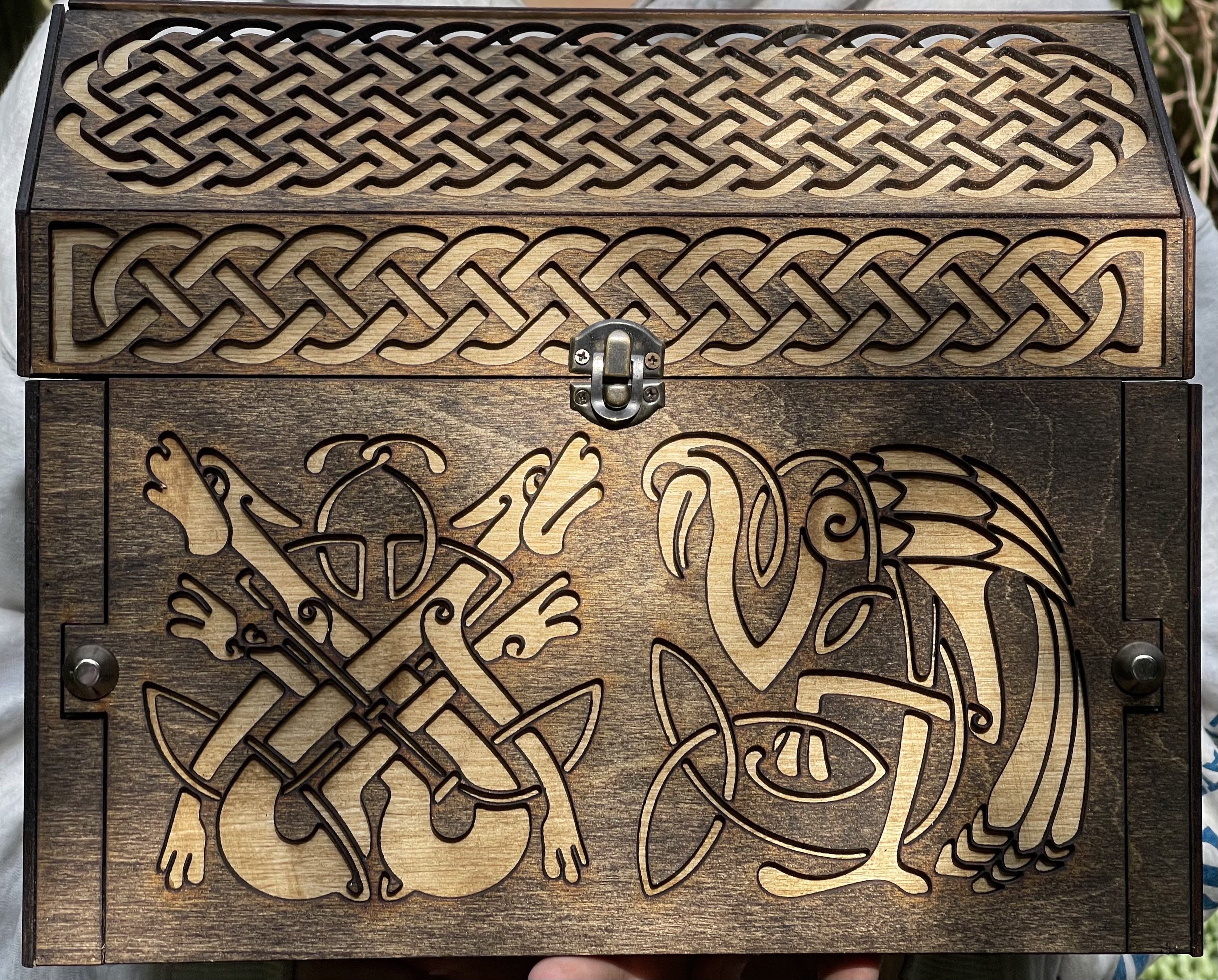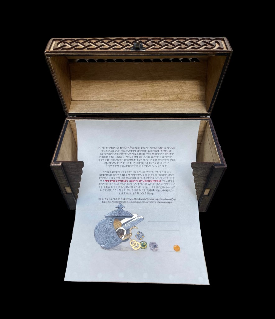 This scroll however needed…more. I was aided by my Laurel, Goodwife Michel Almond de Champagne, for this part. We created a presentation box, from which the front panel would fold down, unfurling the scroll to be presented and displayed. This box held another purpose as well…I had requested that members of his household add a small token of their relationship with him to this box, in essence, creating a real treasure box.